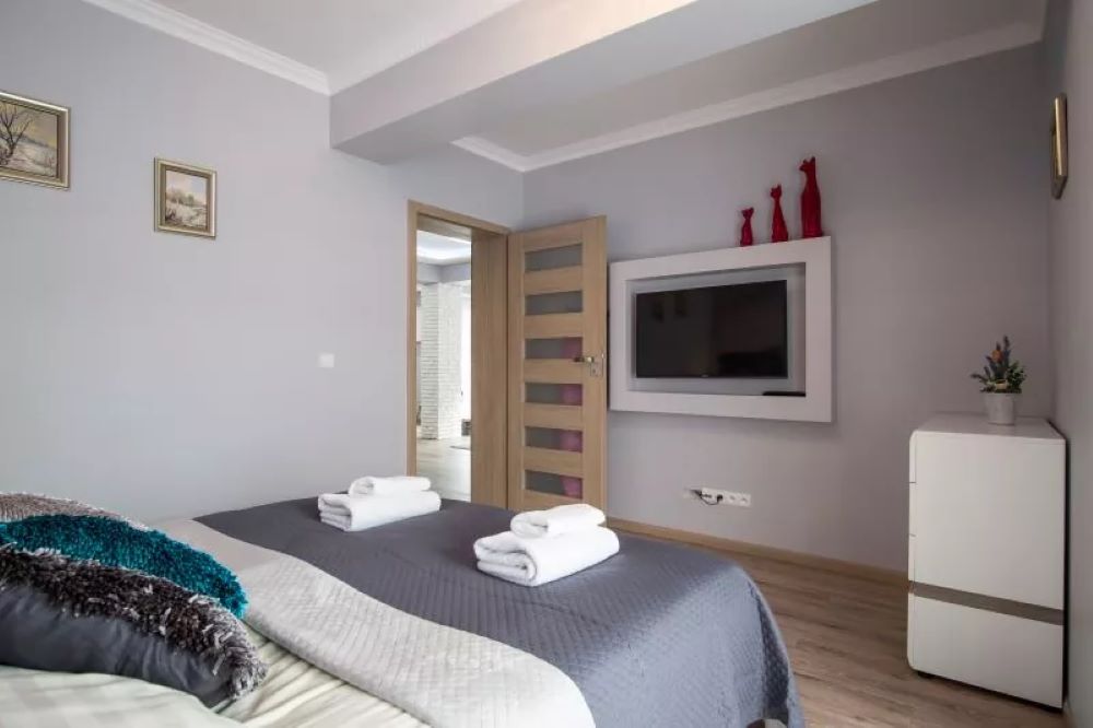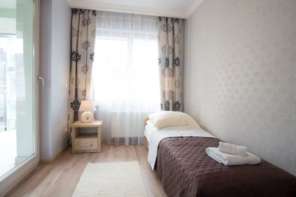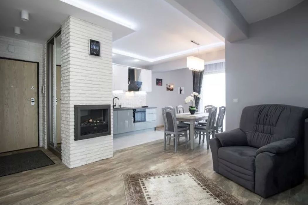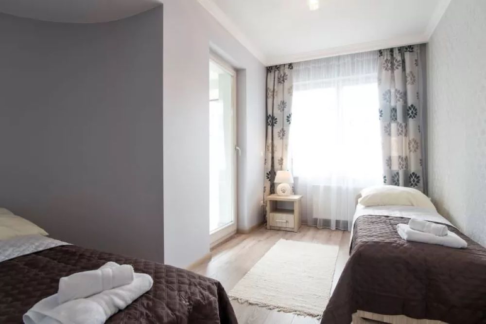 Okazały apartament z dostępem do jacuzzi, basenu i sauny. Składa się z dwóch sypialni i przestronnego salonu z rozkładaną sofą i TV. To pomieszczenie połączone jest z pełni wyposażonym aneksem kuchennym. W łazience jest kabina prysznicowa, a także pralka i suszarka do włosów. W standardzie Wi-Fi i klimatyzacja. Do apartamentu przynależy 1 miejsce parkingowe.